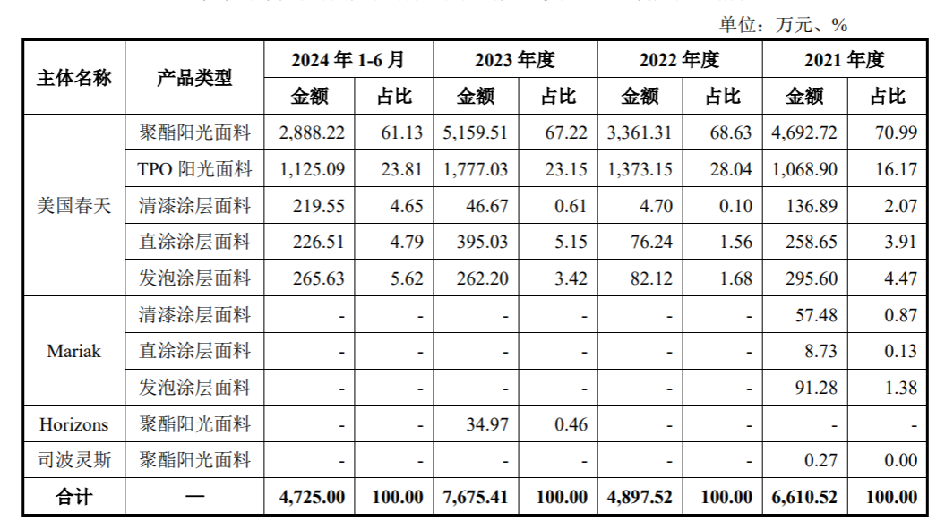 对此,温多利回复称,2021年6月份以来,Mariak开始通过美国春天采购公司产品,不再独立采购。从此开始,除子公司Horizons合作初期的采购以外,美国春天已实现向公司的统一采购,主要采购产品以聚酯阳光面料和TPO阳光面料为主,报告期内各期占比分别为87.16%、96.67%、90.37%和84.94%。