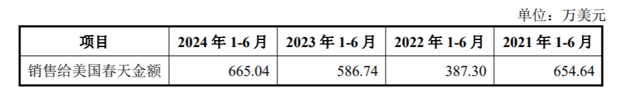 由上表所示,在剔除汇率影响后,报告期内除2022年受并购整合期和美国下游市场短期承压的影响以外,其余年度1-6月销往美国春天金额基本保持稳定。2024年以来,随公司腈纶面料、无锑面料、大提花面料等新产品的研发成功并实现规模化生产,双方合作深度和广度逐步提升,美国春天将更多订单转移至公司采购,公司销往美国春天的金额增长具备合理性。