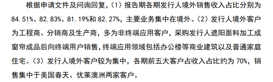 温多利境外客户为工程商、分销商及生产商,多为非终端应用客户,采购温多利遮阳面料加工成窗帘成品后向最终用户销售,终端应用领域包括办公楼等商业建筑以及普普通通的家庭住宅。