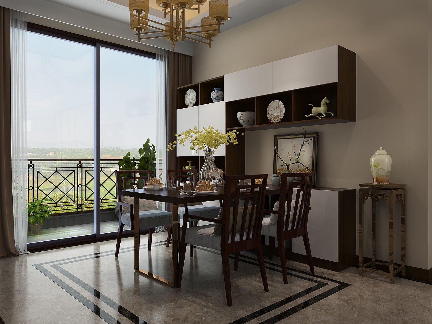 请看第一款中式餐厅窗帘效果图,大大的落地窗,让餐厅拥有绝美的风景优势,对称设计非常自然,白色纱帘+棕色布艺窗帘的搭配呈现出优雅的视觉效果。如果觉得阳光过于强烈,则可以拉上窗帘,点亮蜡烛,与ta来一个浪漫的烛光晚餐。